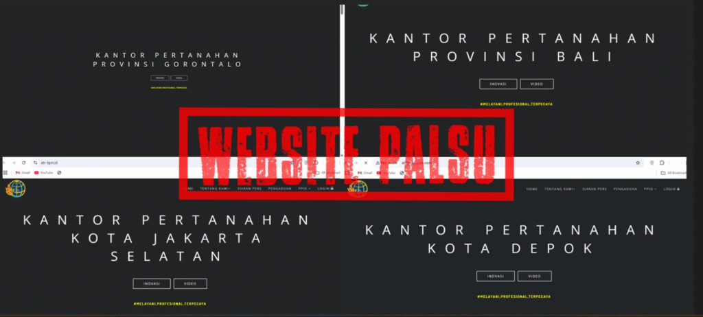 Kementerian Agraria dan Tata Ruang/Badan Pertanahan Nasional (ATR/BPN) mengeluarkan peringatan kepada masyarakat luas terkait maraknya situs web palsu yang mengatasnamakan satuan kerja (Satker) di lingkungan kementerian tersebut.
