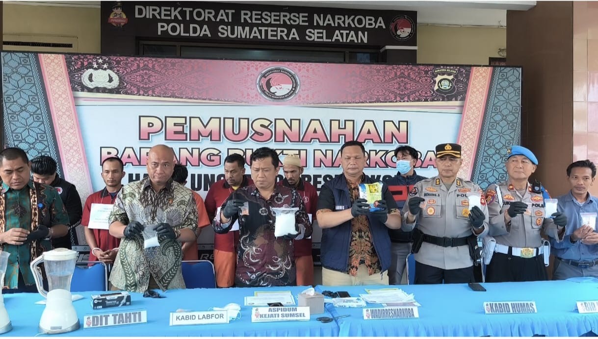 PALEMBANG – Direktorat Reserse Narkoba (Ditresnarkoba) Polda Sumatera Selatan memusnahkan barang bukti narkotika berupa sabu-sabu seberat 2,6 kilogram dan pil ekstasi seberat 1.000 gram, Jumat (19/12/2025).