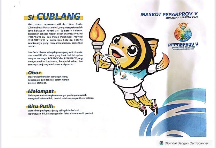 Gubernur Sumatera Selatan (Sumsel) Herman Deru secara resmi telah menyetujui desain maskot Si Cublang (Ikan Botia) dan logo resmi Pekan Olahraga Provinsi (Porprov) XV serta Pekan Paralimpik Provinsi (Peparprov) V Sumsel Tahun 2025 yang merupakan usulan dari Bupati Muba, Mohammad Toha.