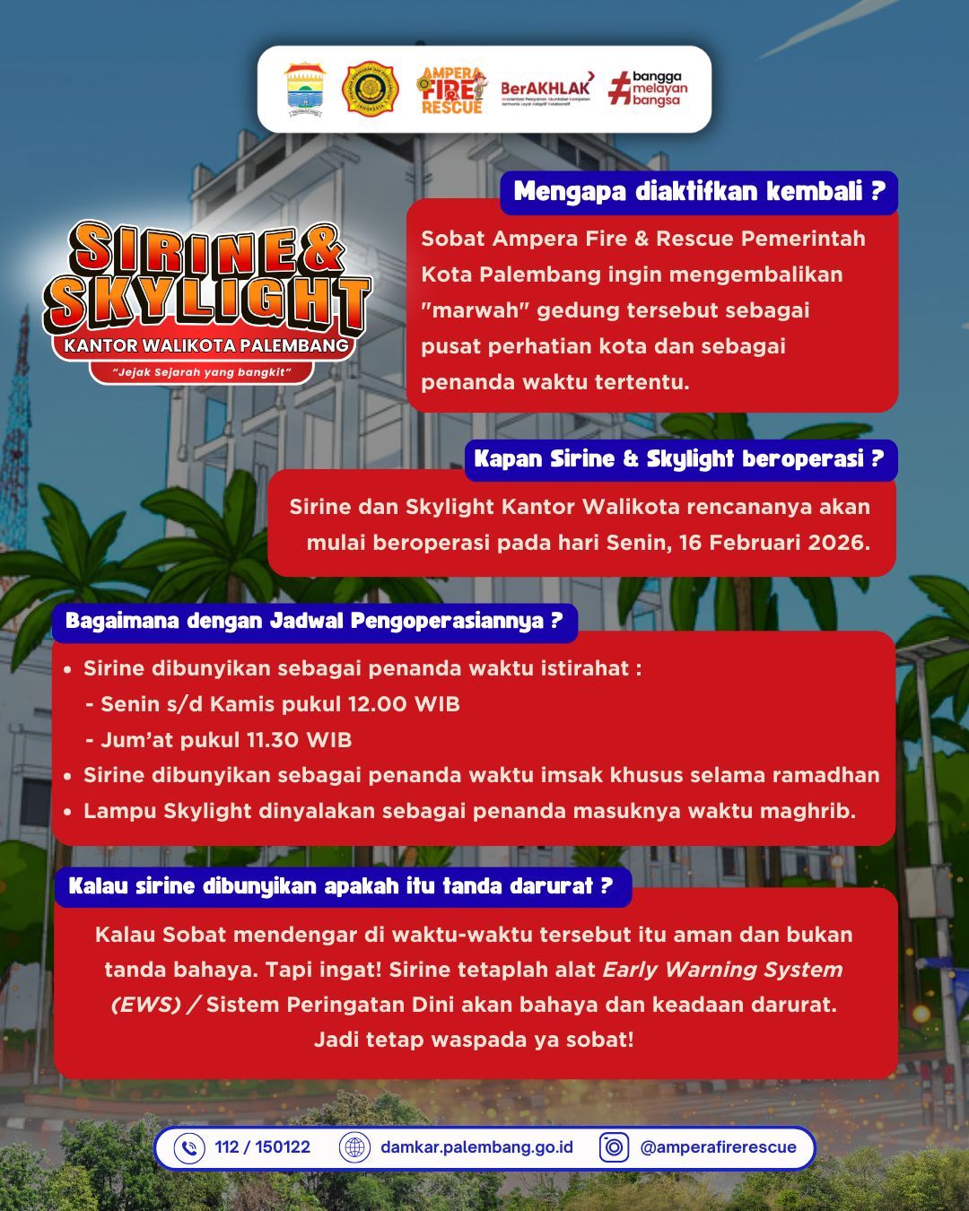 PALEMBANG – Pemerintah Kota Palembang mulai besok (16/2/2026) akan mengaktifkan kembali fasilitas Sirine dan Lampu Skylight di Gedung Kantor Walikota Palembang.