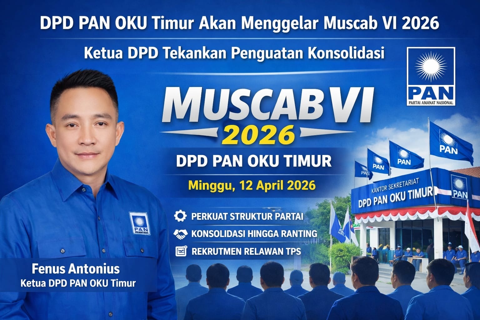 OKU TIMUR — Dewan Pimpinan Daerah (DPD) Partai Amanat Nasional Kabupaten Kabupaten Ogan Komering Ulu Timur akan menggelar Musyawarah Cabang (Muscab) VI Tahun 2026 pada Minggu (12/4/2026).