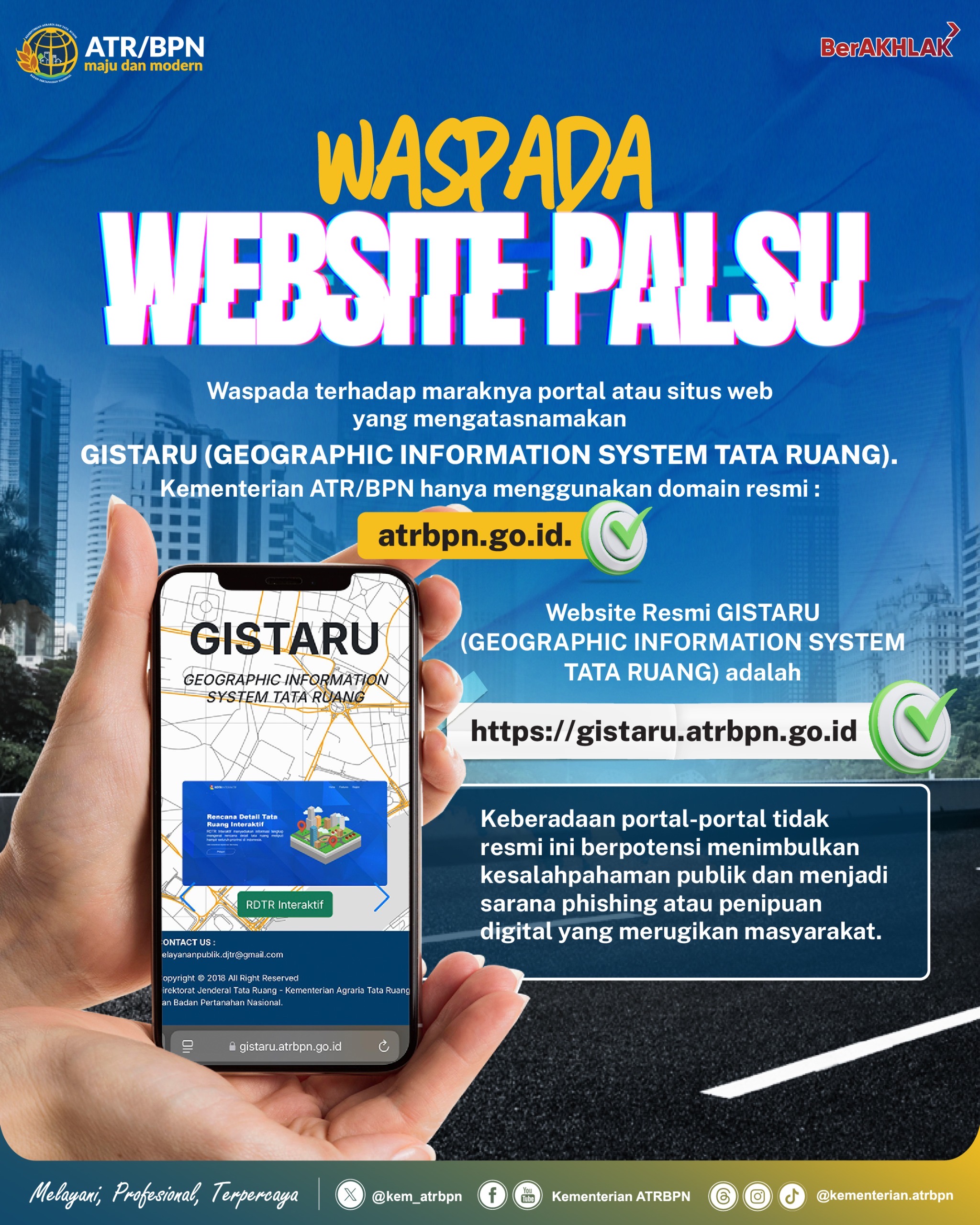 Halo #SobATRBPN, bersama ini Minaru imbau untuk lebih waspada terhadap website palsu dengan mengatasnamakan fitur Kementerian ATR/BPN.